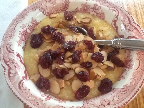 Top polenta with cranberries, chopped dried apricots or both, almonds and a sprinkle of salt.