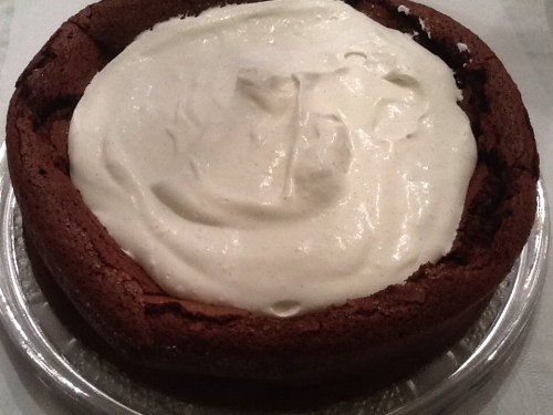 With or without whipped cream, it is a knockout! Like other flourless cakes, it relies on stiff egg whites for height. I think it's easier to separate the eggs when they're cold, but whip the whites when they're room temp. Any touch of yellow in the whites will do you in. Been there and done that before.