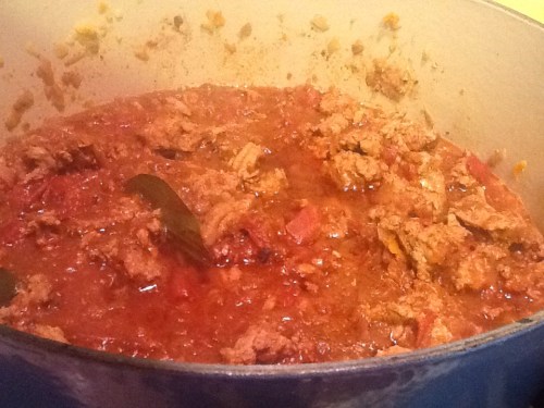 I can’t vouch for its authenticity, but I can say this. Last week I made one of the world’s easiest bean free chili recipes. Plus bean objectors, due to digestive or regional origins, can’t possibly take issue with the stomach warming blend of cumin, chili AND chocolate! In this case it is cocoa powder and brown sugar, but if you have an ounce of bittersweet, trade it out. The math tutor watched me throw the whole kit and caboodle (kaboodle?) together in about no time. Chili is stew…you add this and that, whatever you have, spicy or not depends on your crowd. This chili is less so, mostly because I forgot the jalapenos at the store and I was too chicken to add more than a quarter teaspoon ground chipotle. One of my dear friends made it to share. It is so potent I keep it in double zip top bags.