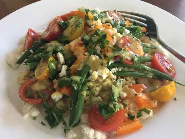 For the ladies and gents who asked. Salad is good any time of day. I like it in the am instead of hot cereal. In this case bulgur subs for oatmeal, but so could barley or wheat berry. Any whole grain. The veg can be poached from leftovers. Do yourself a favor and dress with olive oil or lemon juice, or better yet make a super simple vinaigrette that has zero of the additives of store brands.